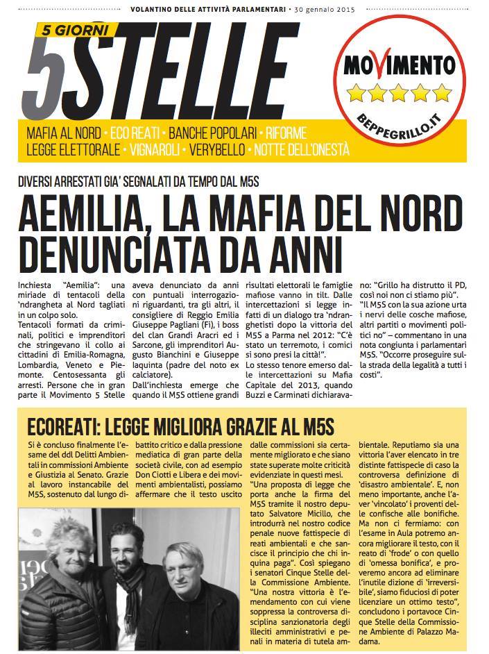 Numero quirinale per #5giornia5stelle di questa settimana che vede concentrarci su tre argomenti. Il primo è l’approvazione al Senato dell’Italicum, con un iter procedurale piuttosto insolito, che ha visto l’aggiunta di intere parti in fase di correzione bozza. Un’azione veementemente contestata in aula dal Movimento 5 Stelle. L’Italicum torna ora al vaglio della Camera con le modifiche approvate a palazzo Madama: i capilista bloccati, la possibilità delle multicandidature ed un premio di maggioranza, secondo il M5S, passibile di incostituzionalità. Ci occupiamo poi dello strano caso BankEtruria che ha visto un improvviso boom del prezzo delle azioni dopo l’iniziativa sulle banche popolari del governo Renzi. Infine, ovviamente, ci occupiamo dell’elezione del nuovo Presidente della Repubblica alla vigilia del voto che potrebbe rivelarsi decisivo per la fumata bianca sul nome di Sergio Mattarella. FONTE