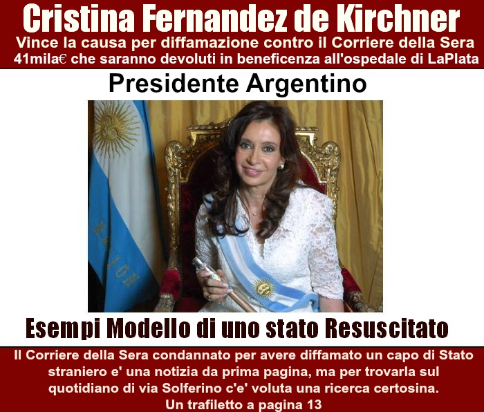 Il Corriere della Sera condannato per avere diffamato un capo di Stato straniero è una notizia da prima pagina, ma per trovarla oggi sul quotidiano di via Solferino c’è voluta una ricerca certosina. Un trafiletto a pagina 13. La notizia ai giornali italiani ieri l’ha data la presidente argentina Cristina Fernandez de Kirchner da Buenos Aires, rendendo noto di aver vinto un processo «per diffamazione» in Italia per un articolo pubblicato nel 2008 del Corriere della Sera (all’epoca il direttore era Paolo Mieli) nel quale si raccontava un presunto shopping che si sarebbe concessa nel centro di Roma a margine di un vertice della Fao. L’articolo, che era stato ripreso da numerosi media argentini, «era impostato con un approccio tipo “guardate che cinica la presidente che va al vertice della fame e poi fa acquisti”», ha detto la presidente a margine di una cerimonia alla Casa Rosada, sottolineando di aver saputo dai legali che la giustizia si era pronunciata a suo favore. «Dicevano che ero stata da Bulgari e avevo comprato non so cosa», ha aggiunto, ricordando la condanna del tribunale a 41 mila euro nei confronti, che saranno devoluti a un’ospedale della città di La Plata, colpita un mese fa da un’inondazione che ha provocato morti e danni ingenti.
