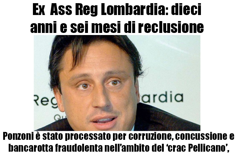 L’ex assessore regionale lombardo Pdl ed ex segretario all’ufficio di presidenza del Pirellone, Massimo Ponzoni, è stato condannato a dieci anni e sei mesi di reclusione dai giudici del Tribunale di Monza. Ponzoni è stato processato per corruzione, concussione e bancarotta fraudolenta nell’ambito del ‘crac Pellicano’, la società immobiliare con sede a Desio di cui l’allora assessore era socio, dichiarata fallita dal tribunale di Monza per un ammanco di circa 600mila euro.