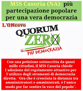 Con una petizione sottoscritta da quasi mille cittadini, il M5S Casoria chiede l’adozione del regolamento attuativo per l’utilizzo degli strumenti di democrazia diretta. “Ora che è cresciuta la distanza tra amministratori e amministrati, è l’unico modo per far sentire la voce del popolo”.